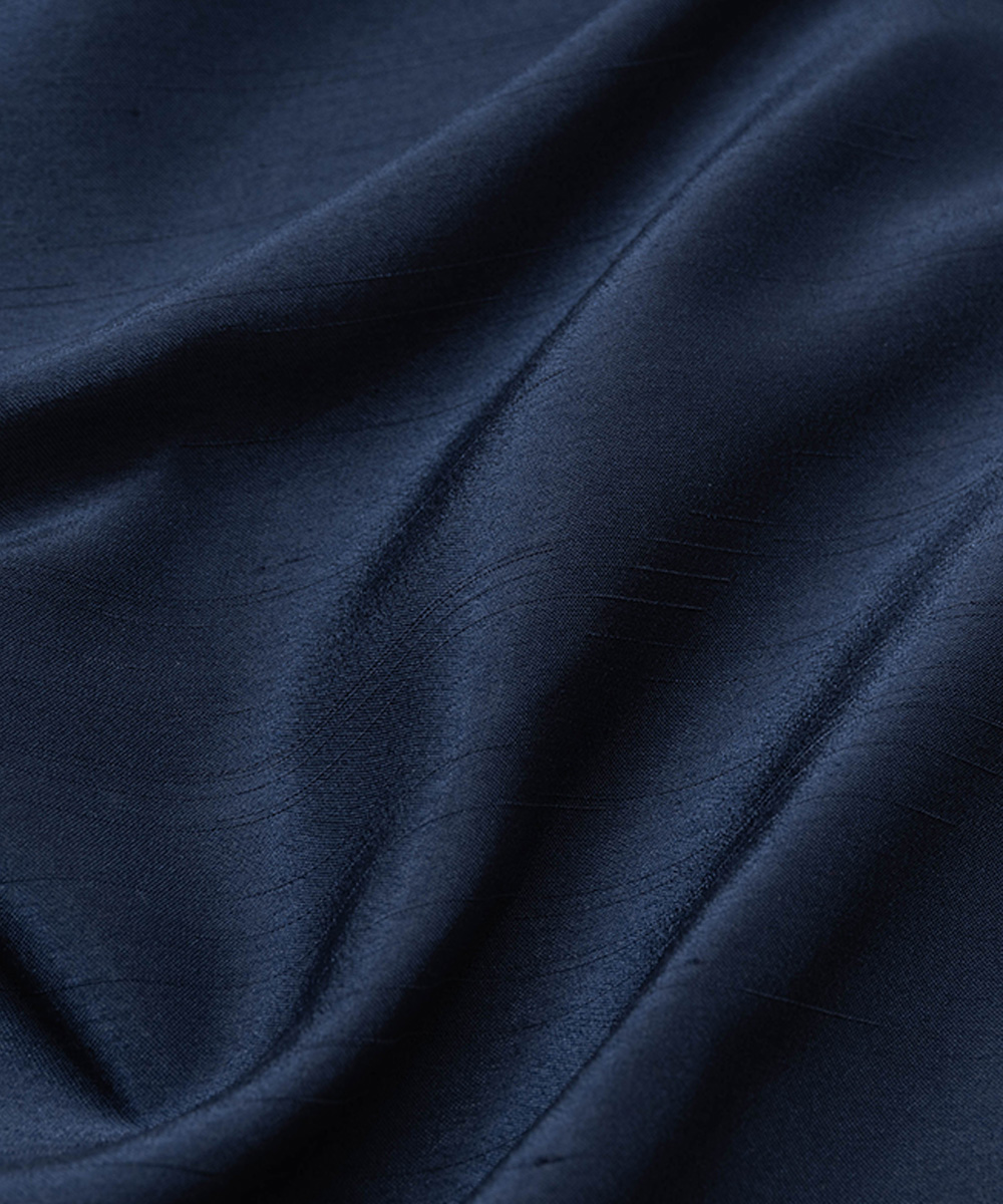 優雅な光沢としなやかな肌触りのポリエステル100%生地。 玉糸と呼ばれる節のある糸を横に織った、本物のシルクの紬織物のような美しさを感じさせます。