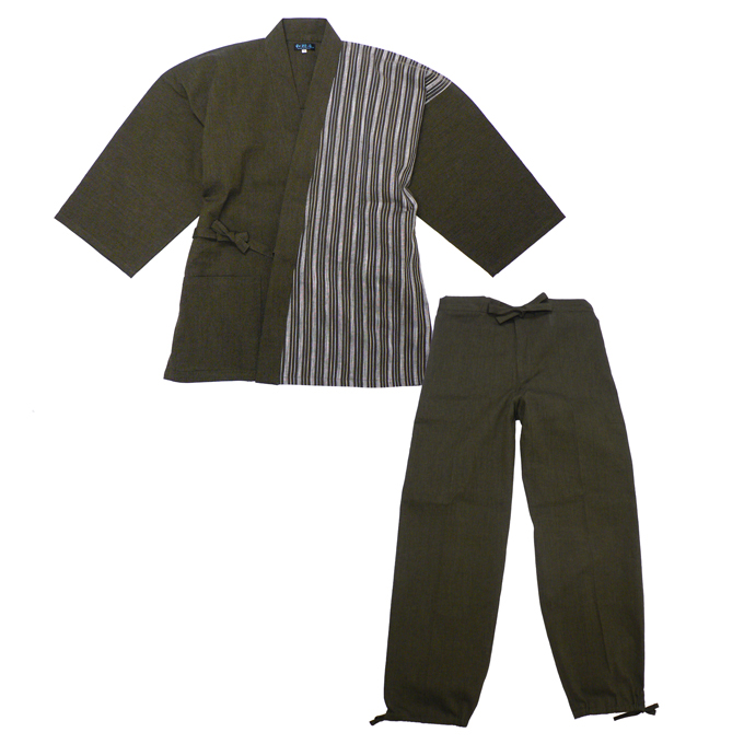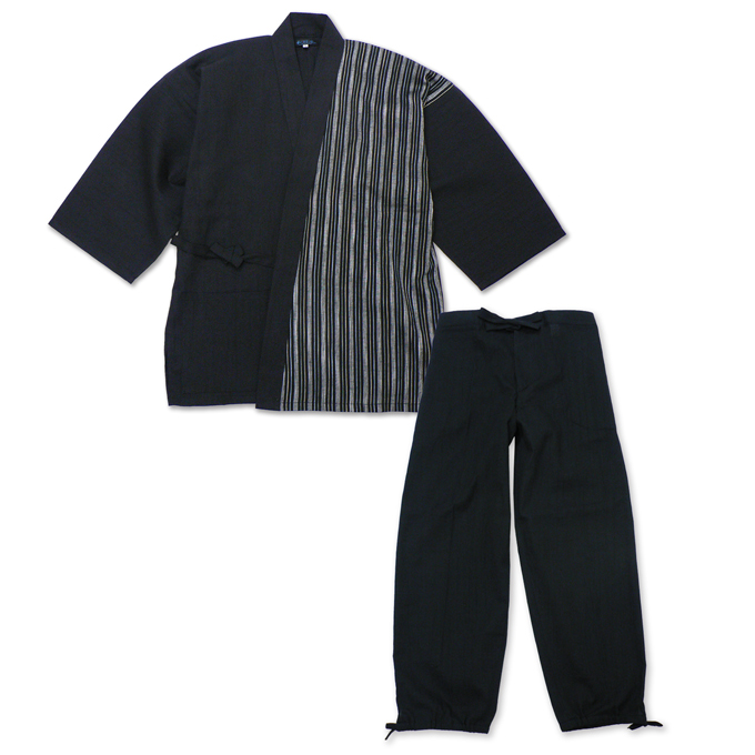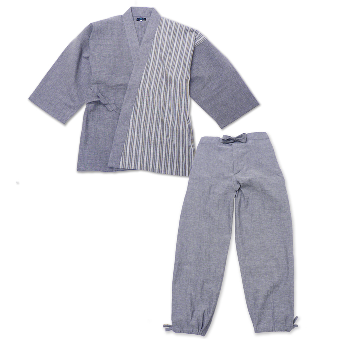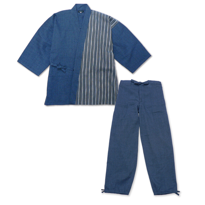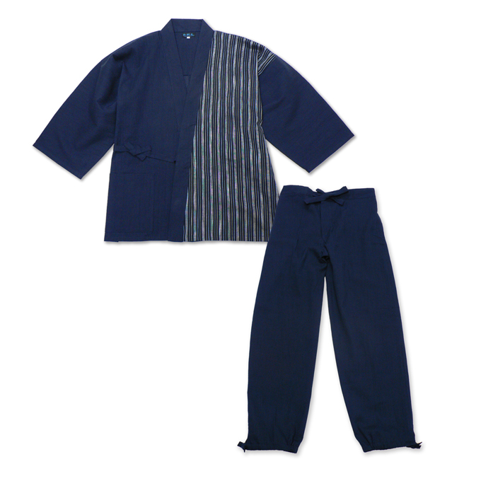 半身には清流をイメージさせる、たて縞の生地を使用。 無地の作務衣とは違う、粋でよりお洒落で涼しげな印象与えてくれます。