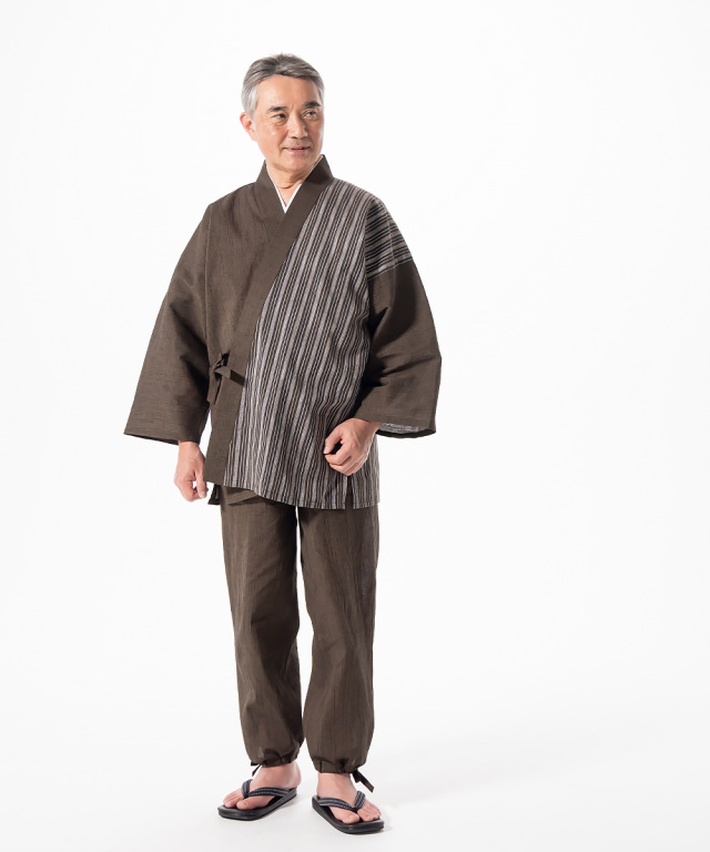 半身には清流をイメージさせる、たて縞の生地を使用。 無地の作務衣とは違う、粋でよりお洒落で涼しげな印象与えてくれます。