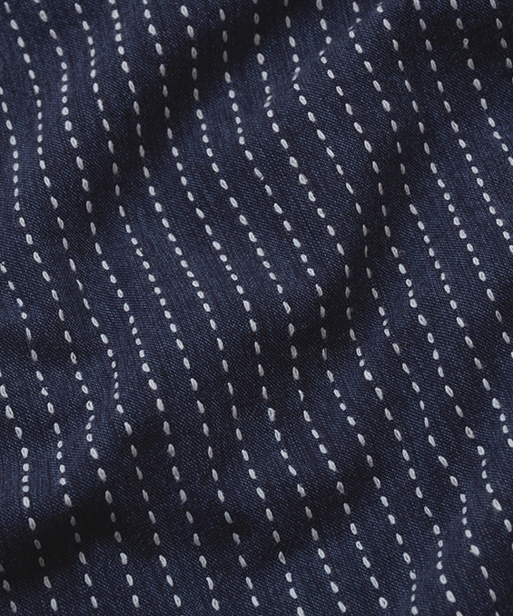 このスペック染めに、地色に馴染む糸を刺子織として加え、非常に手の込んだ味のある風合いの生地を表に使用しております。