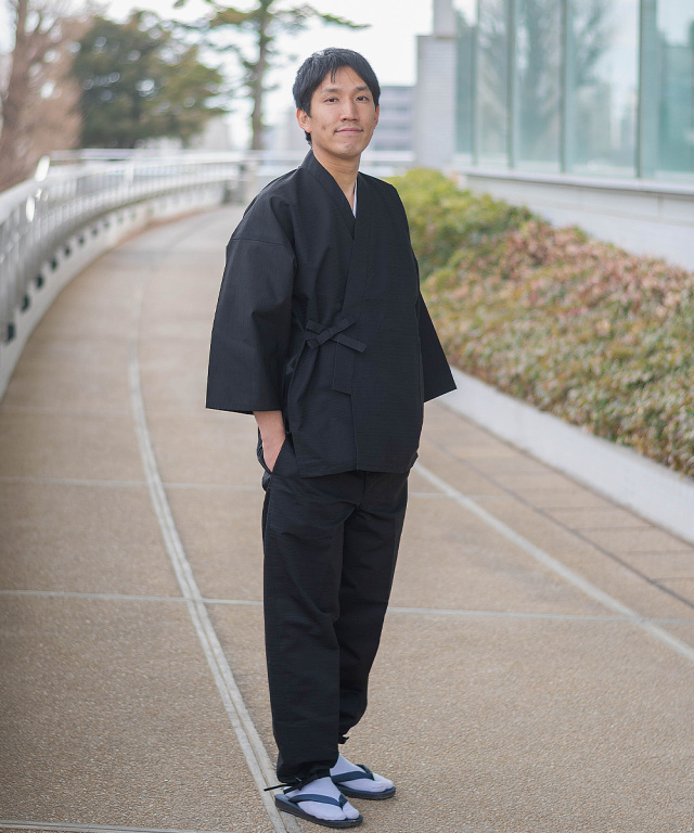 綿紬作務衣の「紺」を着て出かけたところ、驚くほど評判が良かったので、色違いの「黒」も入手してみました。シックな色合いで、グレーの羽織と合わせても見栄えがいいようです。少しだけ格式張った会合に着て行ったところ、まったく違和感なく迎えられ、ある程度公式の場にも着ていけそうだという自信が持てました。