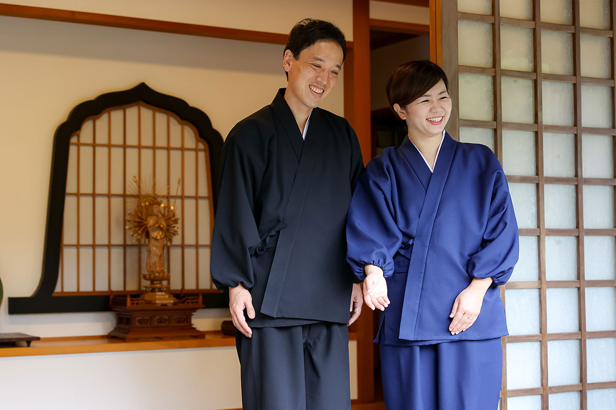 寺院様のご要望により、ズボンの渡り巾の広いゆったりとした作務衣を製作いたしました。