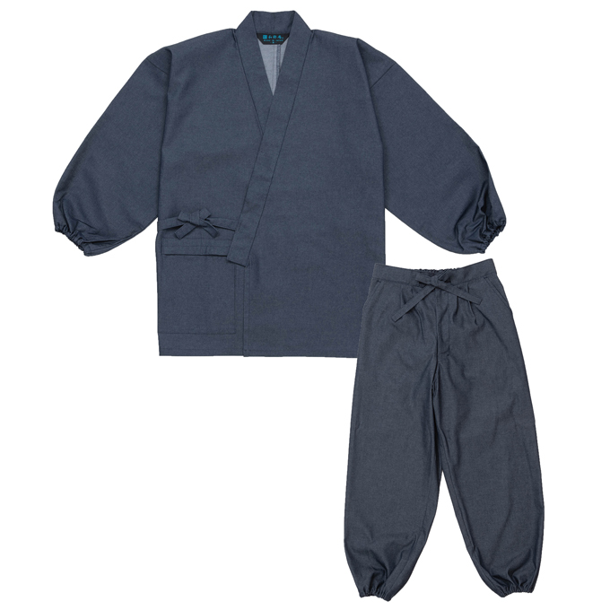 肌に優しい綿と、お手入れしやすいポリエステルが混紡されたデニム生地の作務衣です。