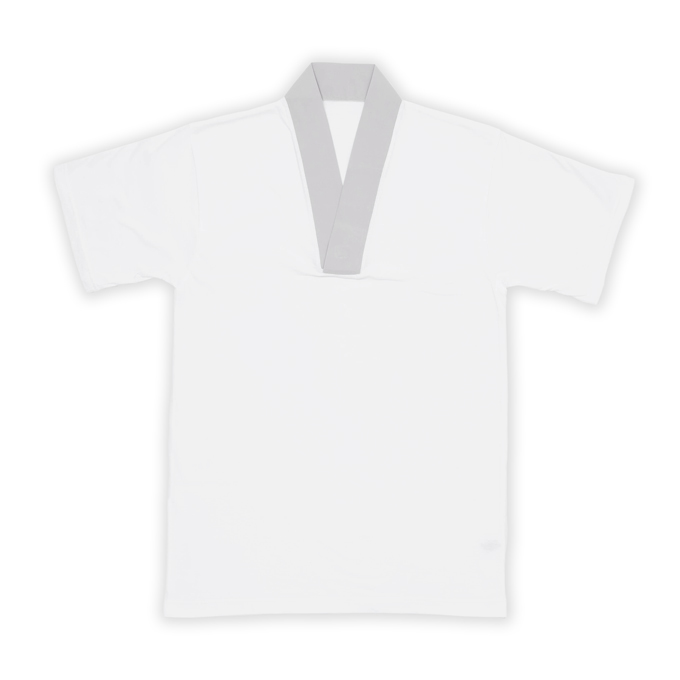衿は作務衣の前合わせに沿うようにカットされ、素材には東レシルックという高品質ポリエステルを使用しています。