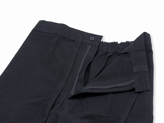 ウエスト後ろゴム前ボタン、ウエスト紐、ファスナー付、ポケット左右各1個、裾共布紐