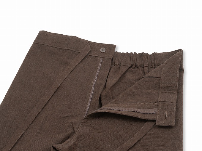 ウエスト後ろゴム前ボタン、ウエスト紐、ファスナー付、ポケット左右各1個、裾共布紐