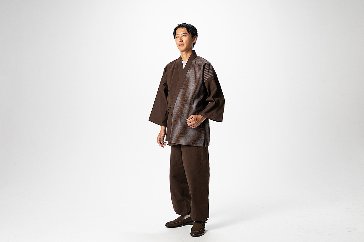 控えめでありながら粋な佇まい、そしてモダンな感性。和の美意識を現代に映す一着です。