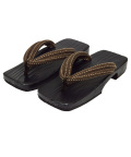 黒地の杉の台に、昔ながらの染色方法と織り方で作られた刺子生地を鼻緒として挿げました。