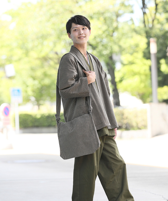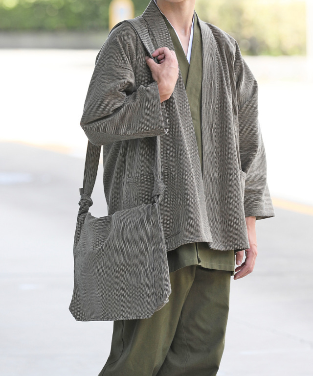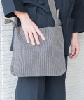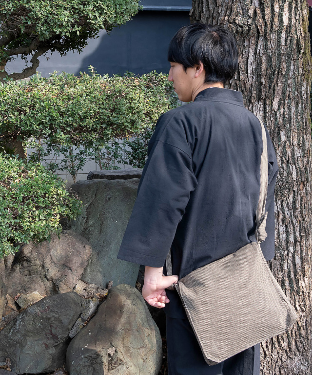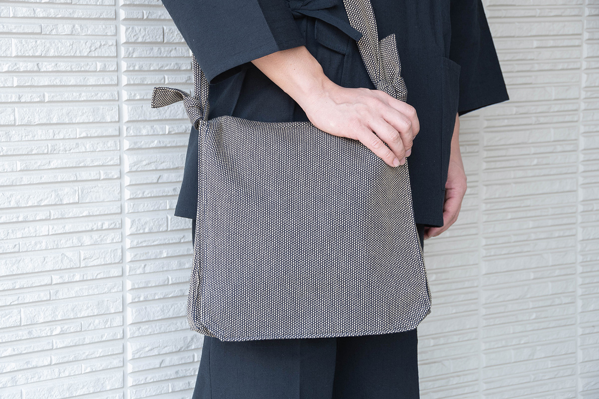 刺子織の美しい小柄ドビー生地を使用。 A4サイズが収納できる便利な大きさ 金具を一切使わない肩紐。お好きな長さに調節可能です。 内ポケット2つ付きで、小物の仕分けに便利です。
