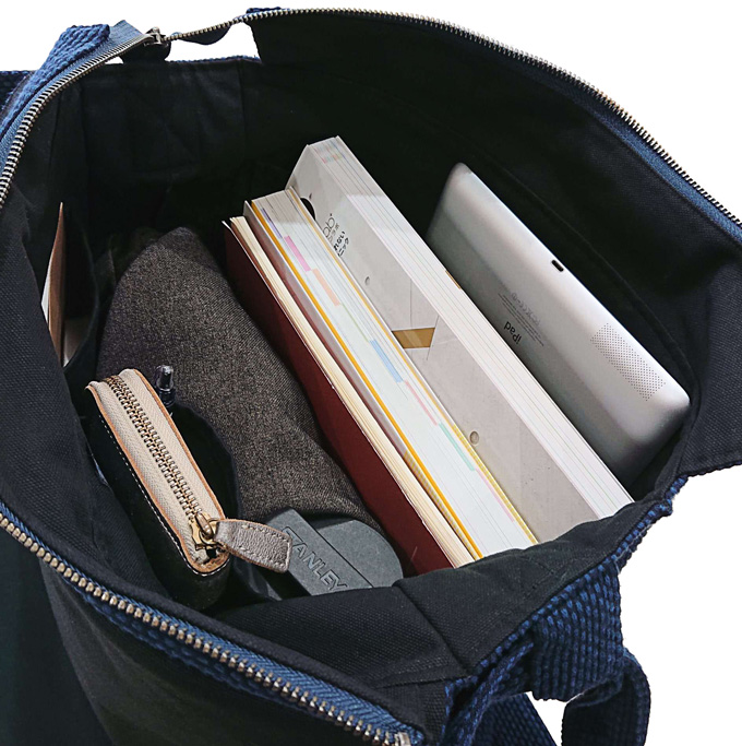 B4サイズのファイルがゆったりと入る大きな頭陀袋を、 B4サイズが余裕で入る大きさ。1〜2泊程度の荷物を詰められます。 入口はしっかりとしたファスナー式。中のものが飛び出さず安心です。 金具を一切使わない肩紐はお好きな長さに調節可能です。 3つの内部ポケットがあり、荷物の仕分けに便利です。