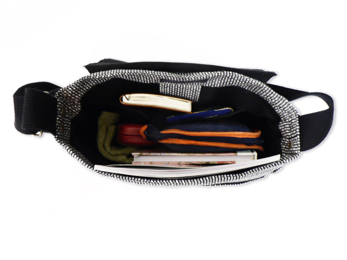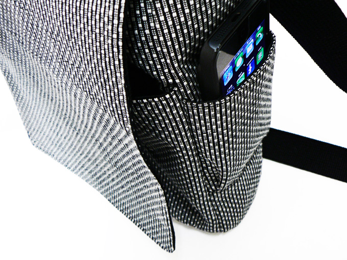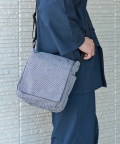 ドビー織機を用いて織った軽く丈夫な生地を、バッグに仕立て上げました。 適度な収納力を発揮し、小型タブレットも収納が可能です。 サイドには大きさの違うポケットがついており、小物をいれるのに大変便利です。 取り出し口には使い勝手のよいマグネットボタンがついています。 紐の長さは好みの長さで調節ができます。