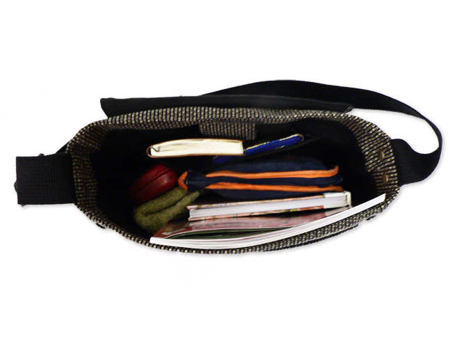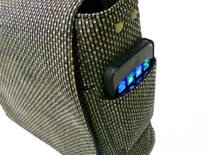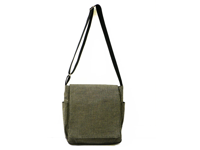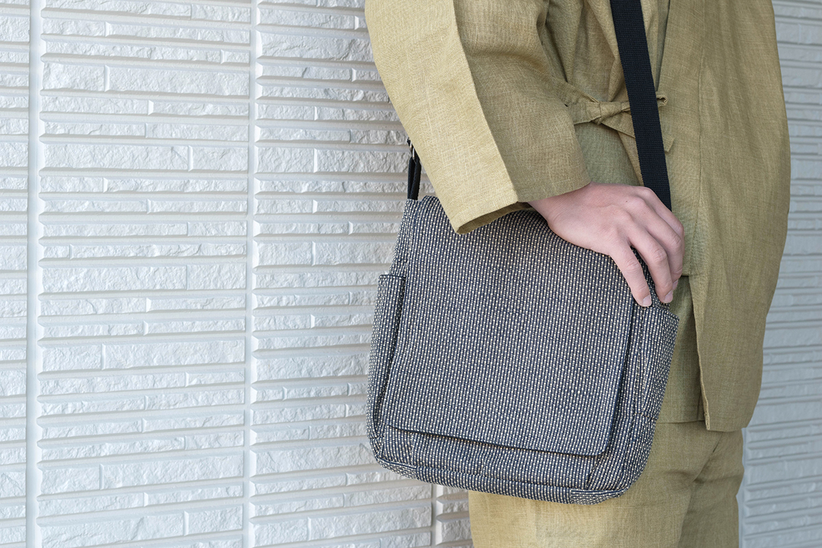 ドビー織機を用いて織った軽く丈夫な生地を、バッグに仕立て上げました。 適度な収納力を発揮し、小型タブレットも収納が可能です。 サイドには大きさの違うポケットがついており、小物をいれるのに大変便利です。 取り出し口には使い勝手のよいマグネットボタンがついています。 紐の長さは好みの長さで調節ができます。