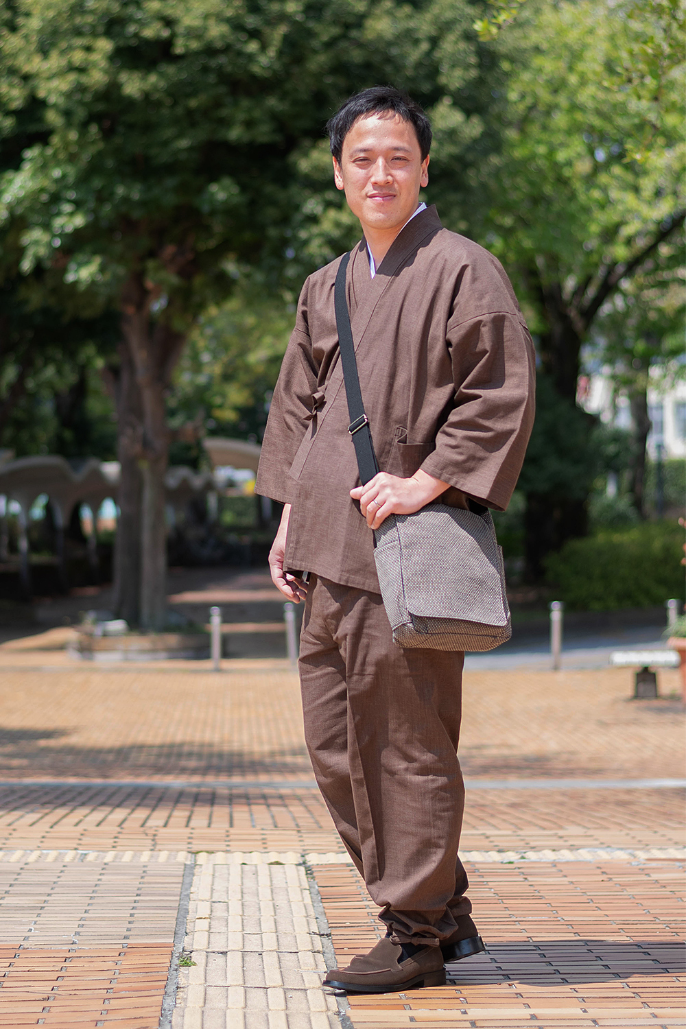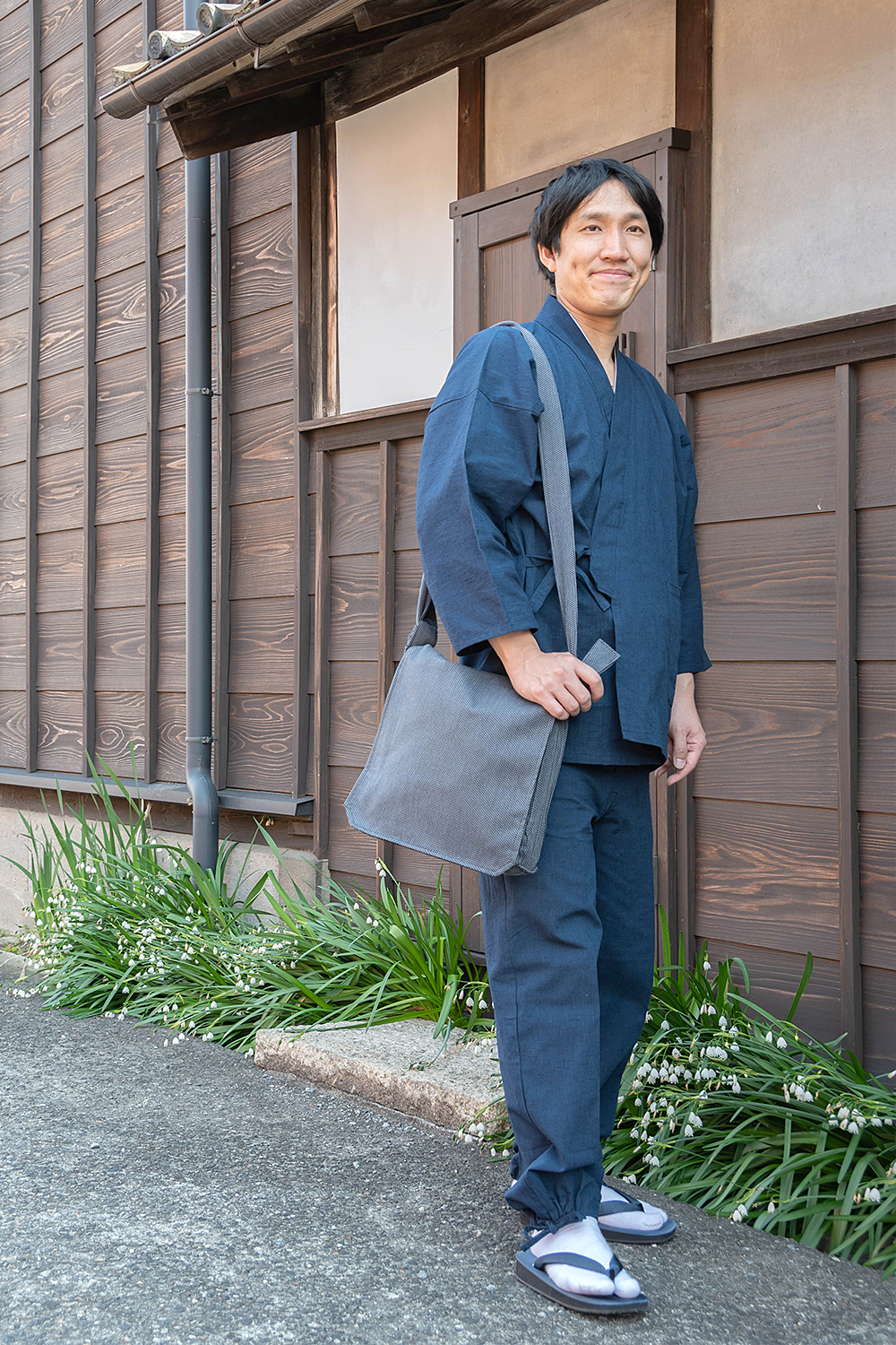 頭陀袋と作務衣を合わせて。