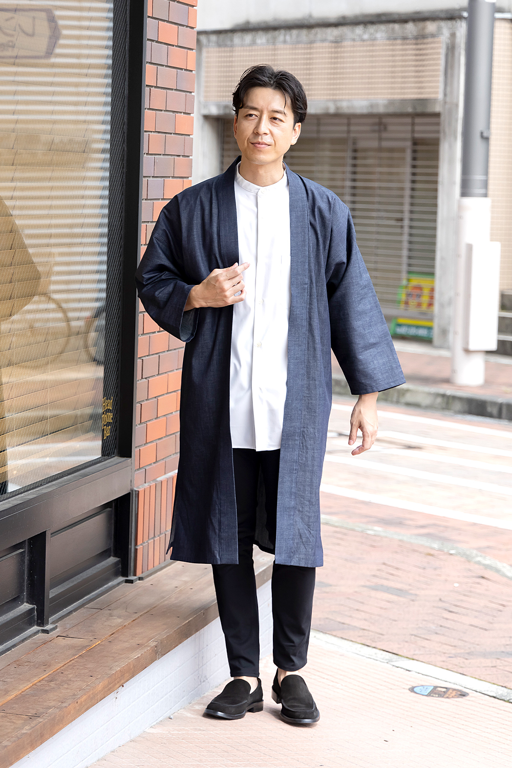 デニムのロング羽織を作務衣と共に。