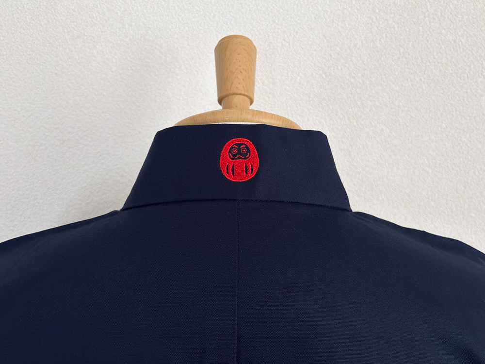だるまの刺繍は2種類ありますが、「H-02:だるま2」は、和の伝統を重んじながらも、少しポップで遊び心を感じさせる小粋なデザインに仕上がっています。