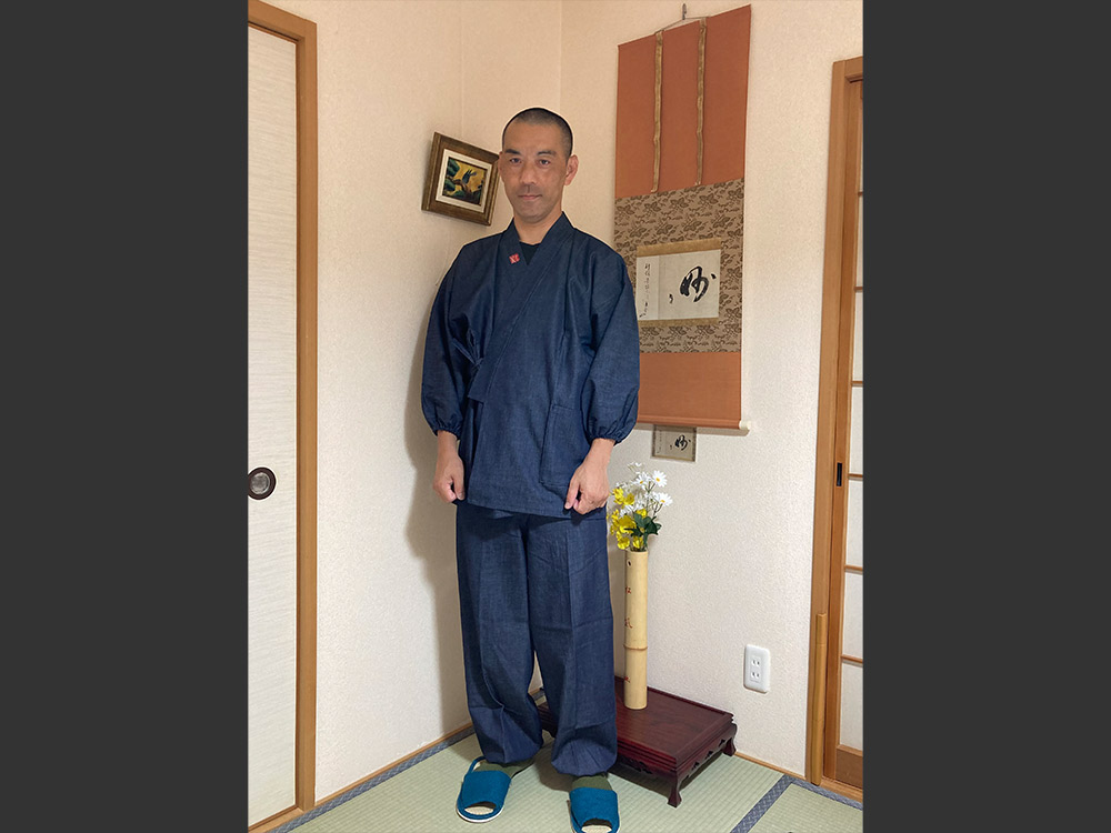 当初今回購入した「カイハラ・デニム」の事は知りませんでしたが、着てみると生地が非常にしっかりしているのに反して着心地はとても柔らかくてびっくりしました。筒袖→ゴム袖、ズボンゴム裾に変更させて頂きましたが、下衣はサイズちょうどピッタリですが袖が少し短く感じました。次回は今回頂いた作務衣に合う作務衣シューズやバッグを購入予定です。